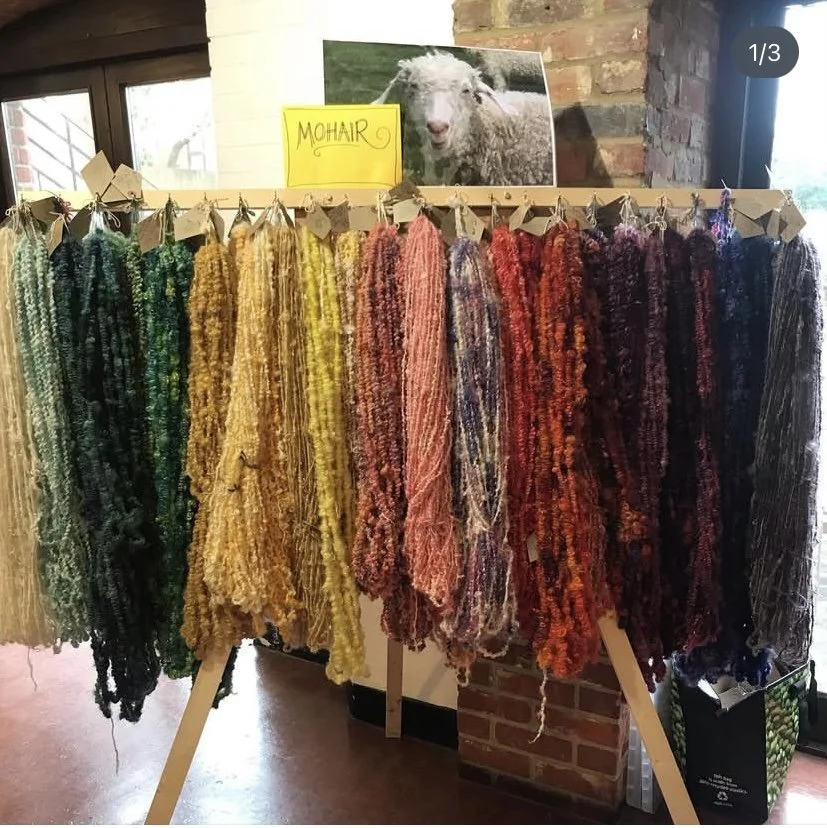 I’m Sue from farm crafts. I spin yarns and art yarns with wool and mohair from our amazing angora goats and mixed breed sheep, all raised for their fibre, on our small off grid farm in Kent.