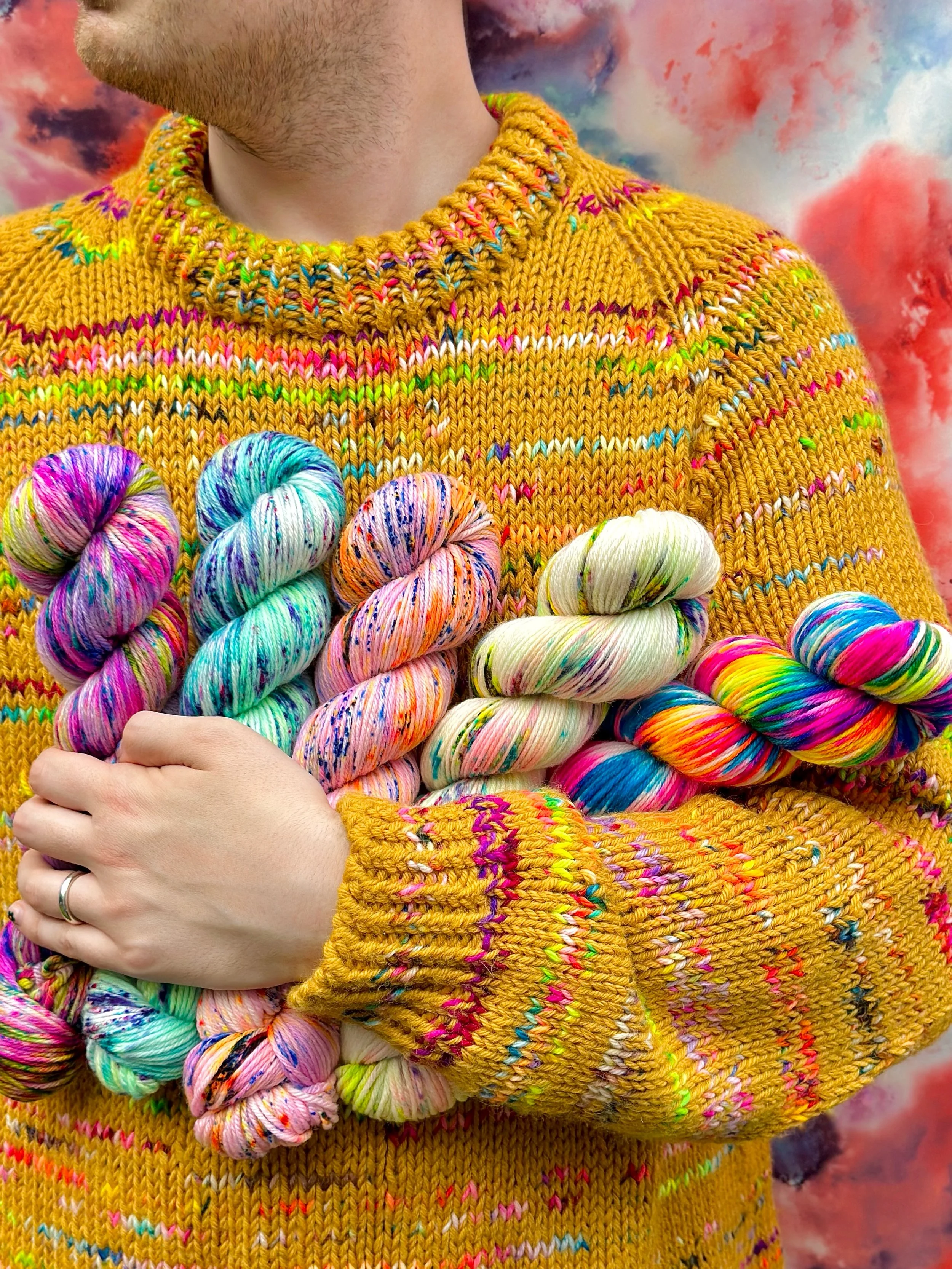 I’m James, a hairdresser by day, I live and work in the beautiful Cotswolds and run my small batch hand dyed yarn business JAMESMAKESYARN from home. I adore all things colour and my desire is to always create one-of-a-kind colourways for colour fanatics, filled with speckles and unique colour combinations. JAMESMAKESYARN is home to not only beautiful and fun hand dyed yarns in a multitude of bases, but also knitting patterns, hand knitted accessories and project notions. At the heart of JAMESMAKESYARN is of course inclusivity and I strive on a daily basis to ensure it is open and welcome to everyone.