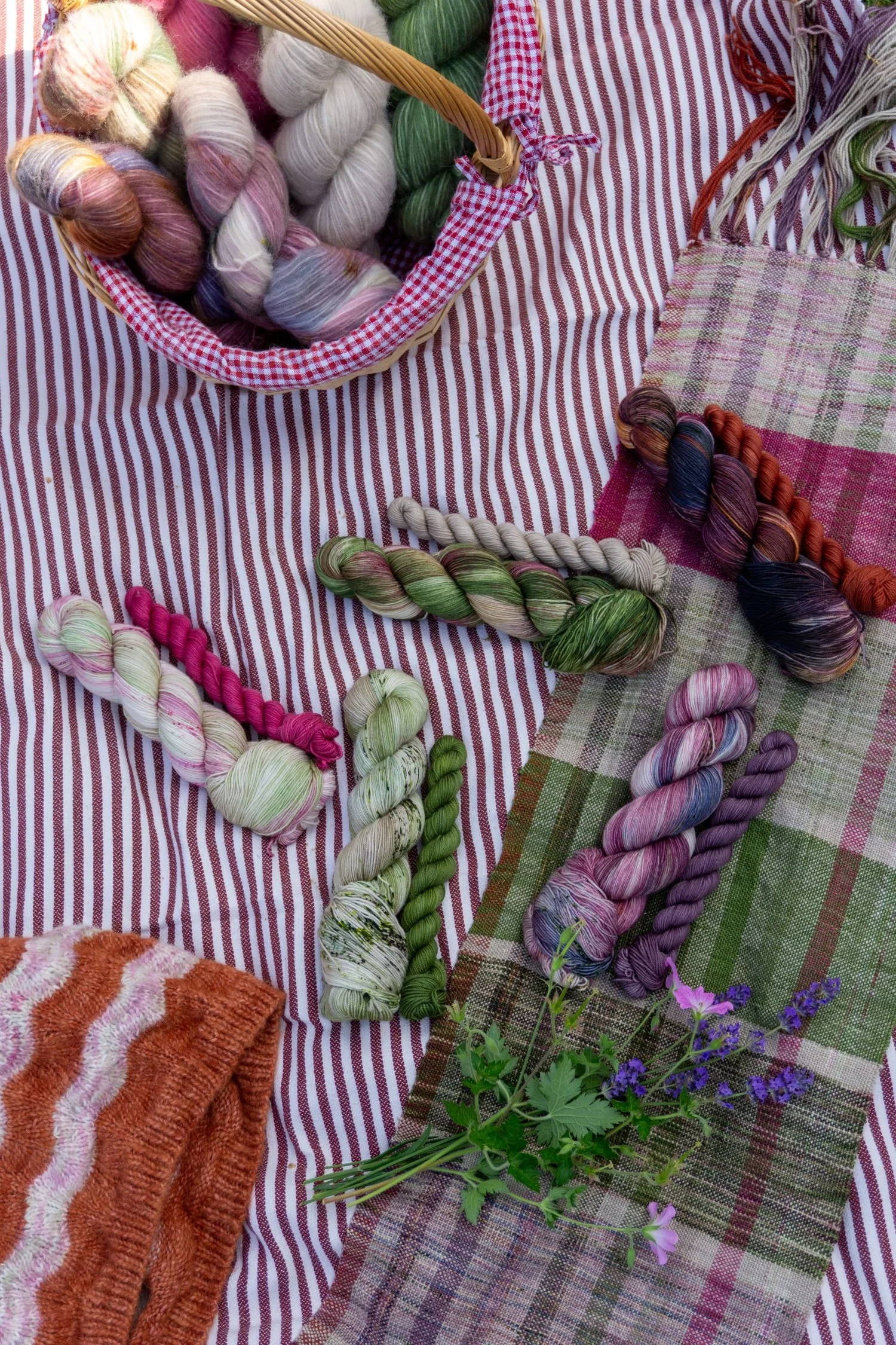 I'm Hannah, a Swedish-born yarn dyer living in the UK since 2010. Raised in a country where knitting was part of school, I fell in love with natural fibres early on. In 2019, I began dyeing yarn and by 2020 started selling small batches. Now it's my full-time job, working from my small shed in Surrey. I specialise in rich, moody colours, often inspired by nature, music, or pop culture. I have also recently started both dyeing fibre, and creating knitting patterns, which is a fun way to add to my creative day!