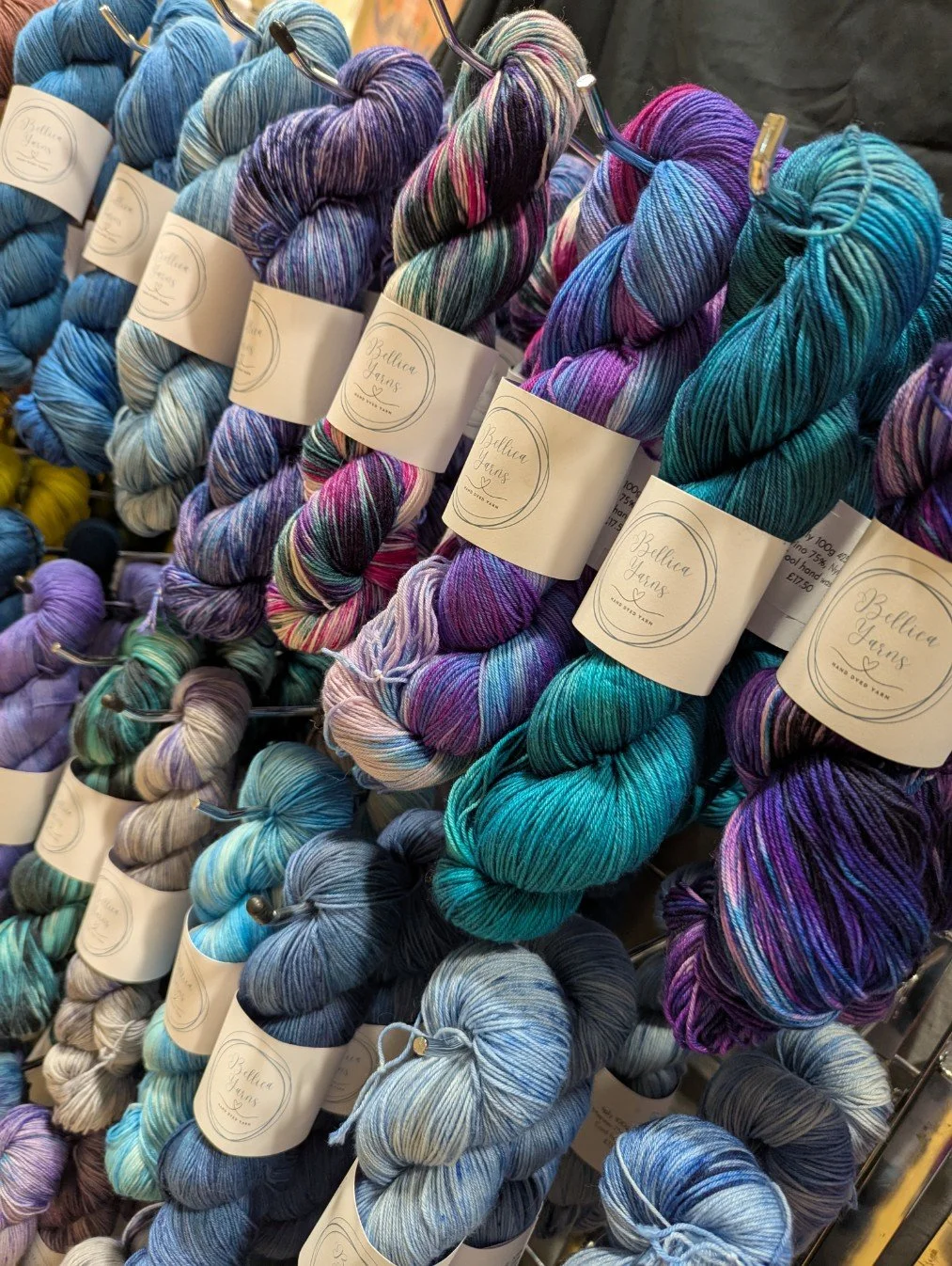 I'm Laura the person behind Bellica Yarns. I create hand dyed variegated, speckled and tonal yarns ,on a variety of bases and weights ,from my home in Bristol. I love colour and enjoy experimenting with different dye techniques. As well as this, I enjoy sewing a range of project bags that includes drawstrings , zippers and my popular wrist bags.