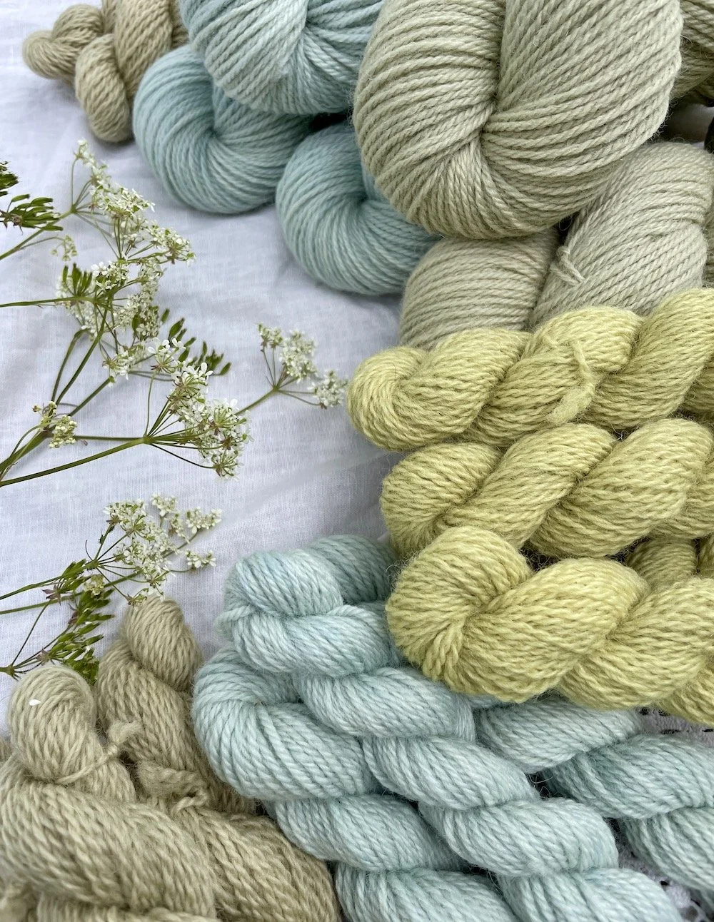I'm Lorna, a natural dyer and artist living in Stroud. I grow my dyes in my garden and allotment, and love celebrating the change in colours through the seasons. All of my wool is non-superwash and plastic free, and lovingly dyed by me in small batches. I love seeing the pigments develop from a dye plant seed to a beautiful skein of wool! I've created unique, folkore-inspired knitting patterns, which I sell on their own or with yarn kits - including the popular Briar Shawl, Market Mitts and Folklore Hood.