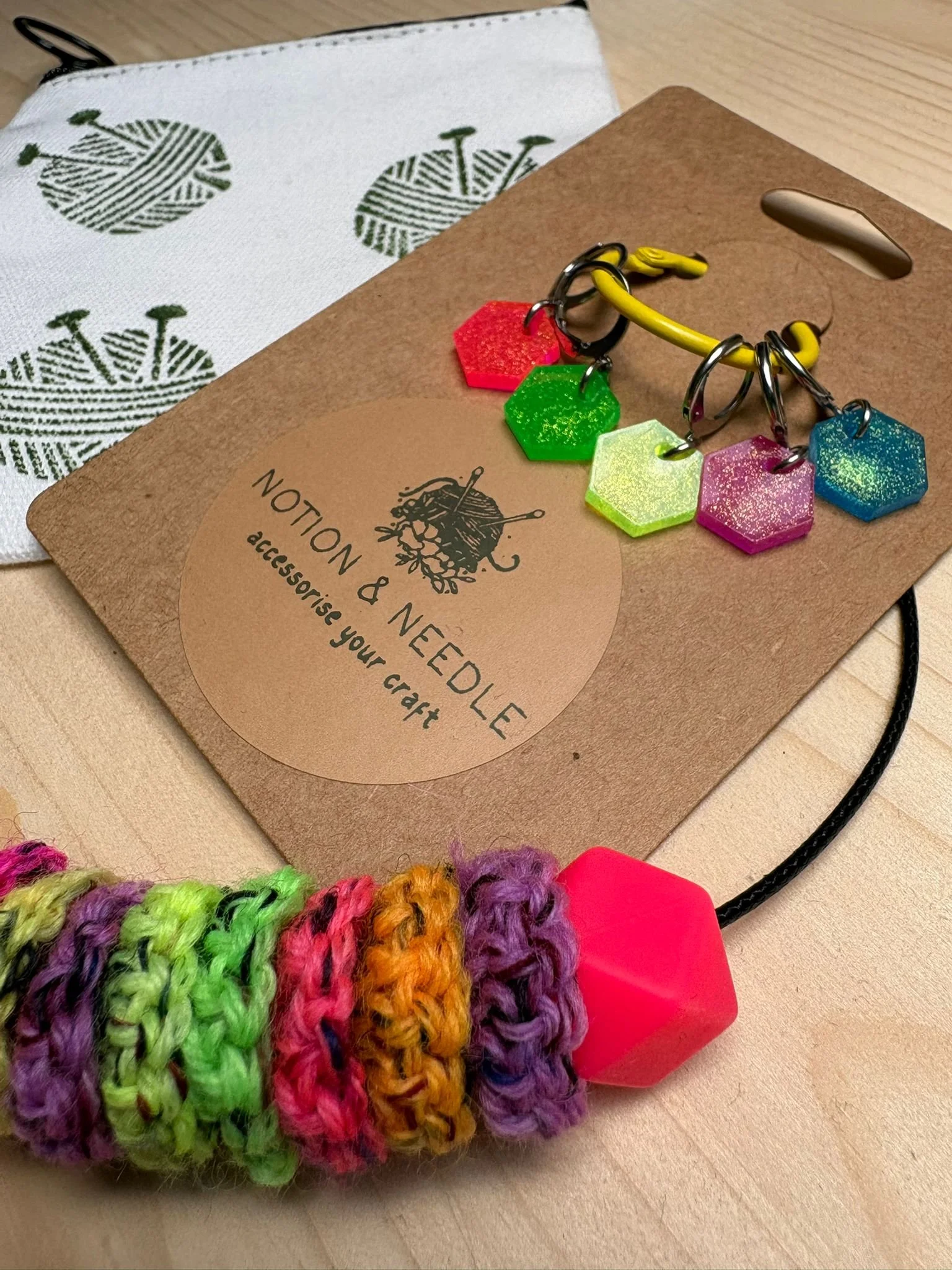 We make hand poured resin stitch markers, bag charms and earrings. We also make crochet necklaces and Indian block printed bags and notion pouches.